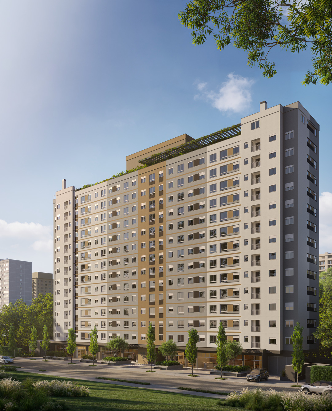 O edifício conta com um projeto arquitetônico contemporâneo e áreas comuns pensadas para estimular convivência, produtividade e bem-estar. No térreo, os moradores encontram hall de entrada, lavanderia compartilhada, pet care, pet place, bicicletário, playground e terraço, reforçando a praticidade e o cuidado com diferentes estilos de vida.